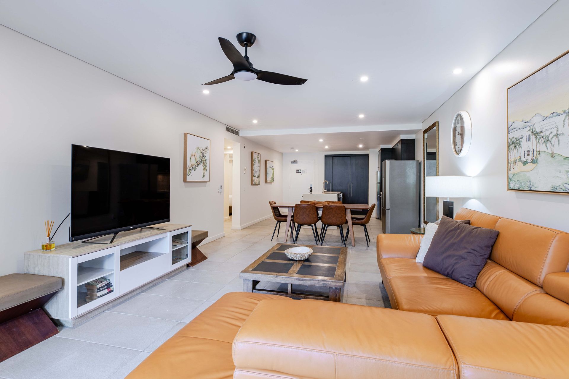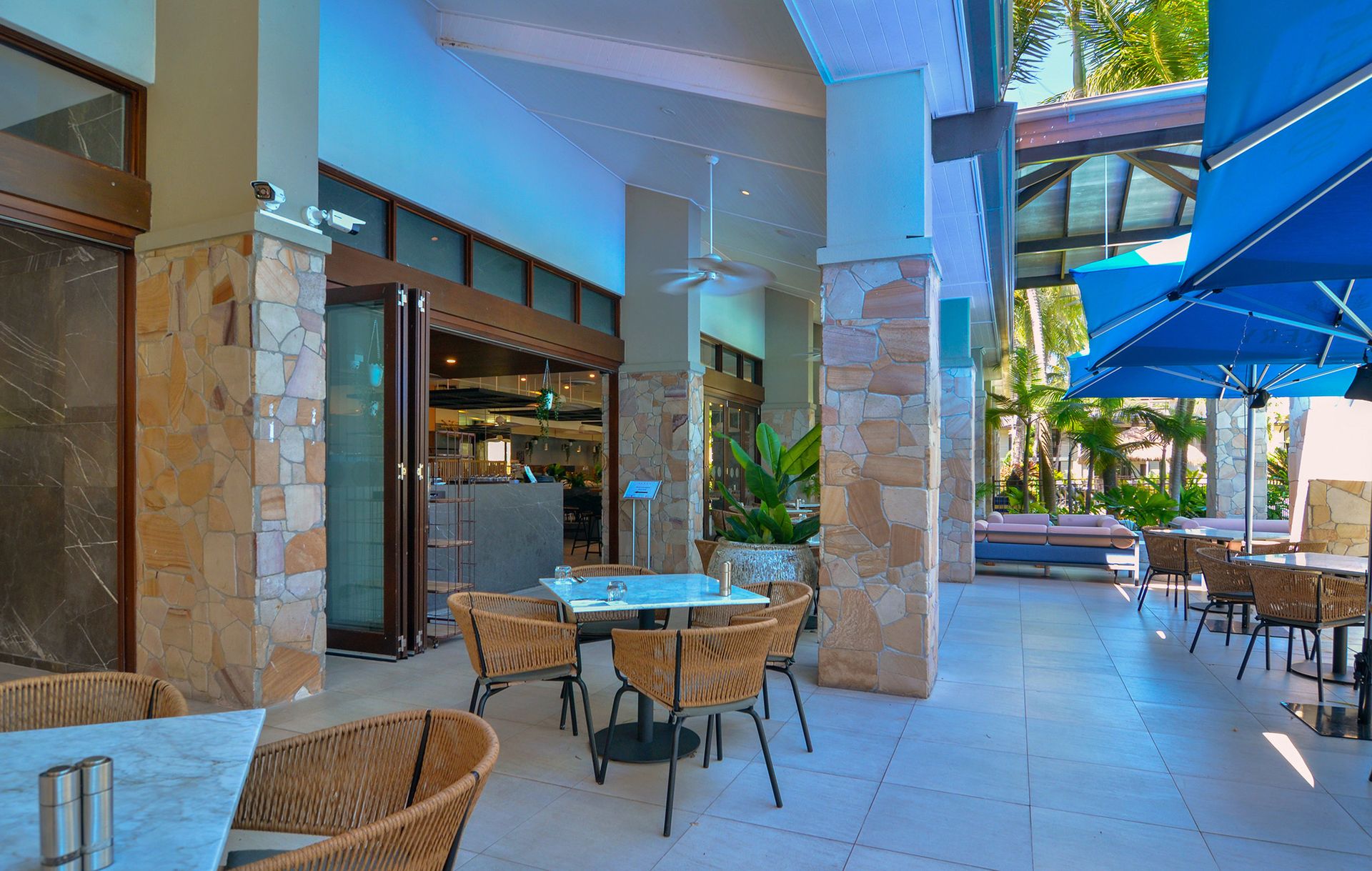 Inside, the breezy, light-filled, open plan living, dining and lounge space is designed for relaxation - especially the large comfy couch. Glass sliding doors invite natural light and tropical breezes in, creating a calm, airy atmosphere complemented by air conditioning and ceiling fans for your year-round comfort.