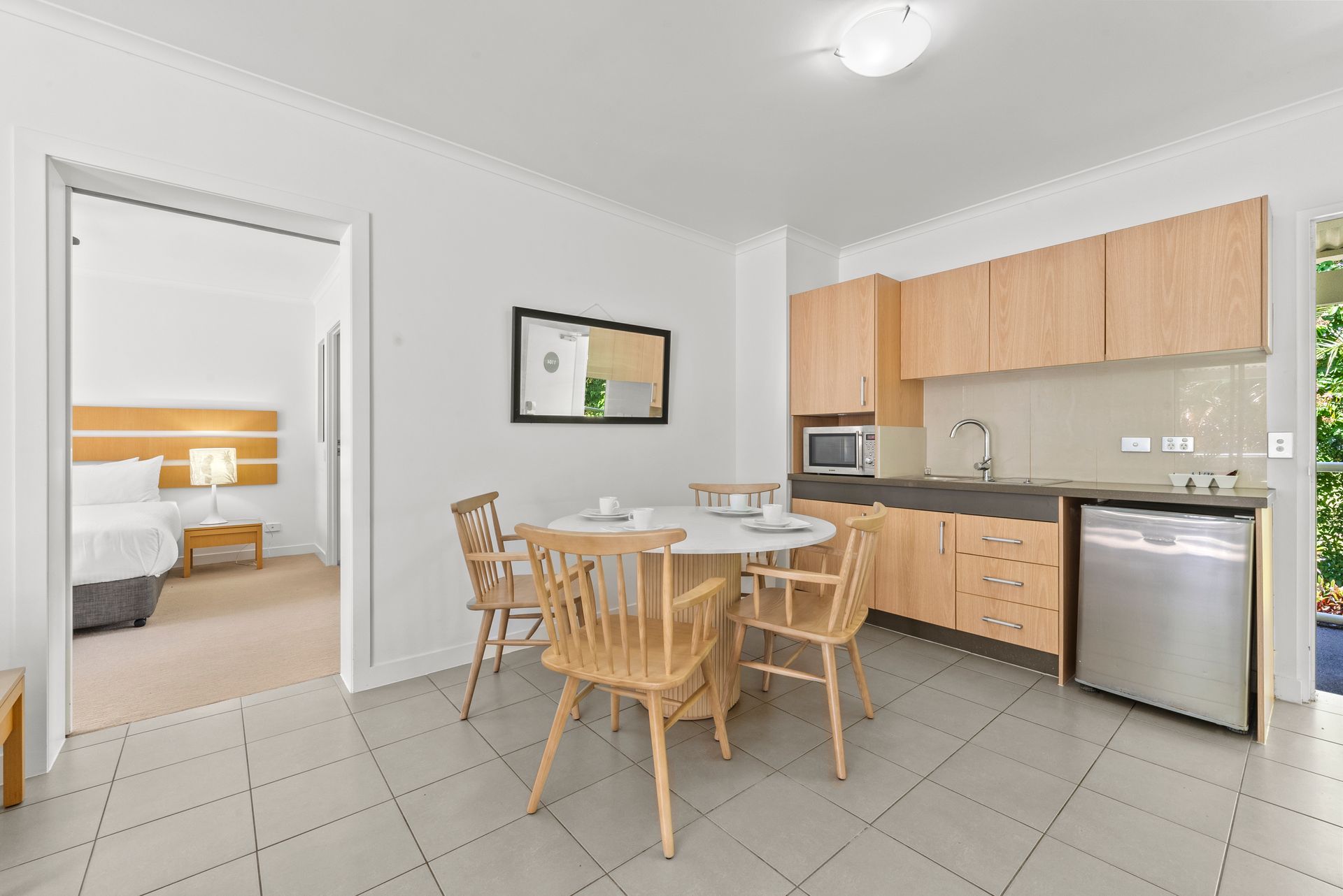 - practical kitchenette (cooktop, fridge, microwave, benchtop, storage, various appliances)