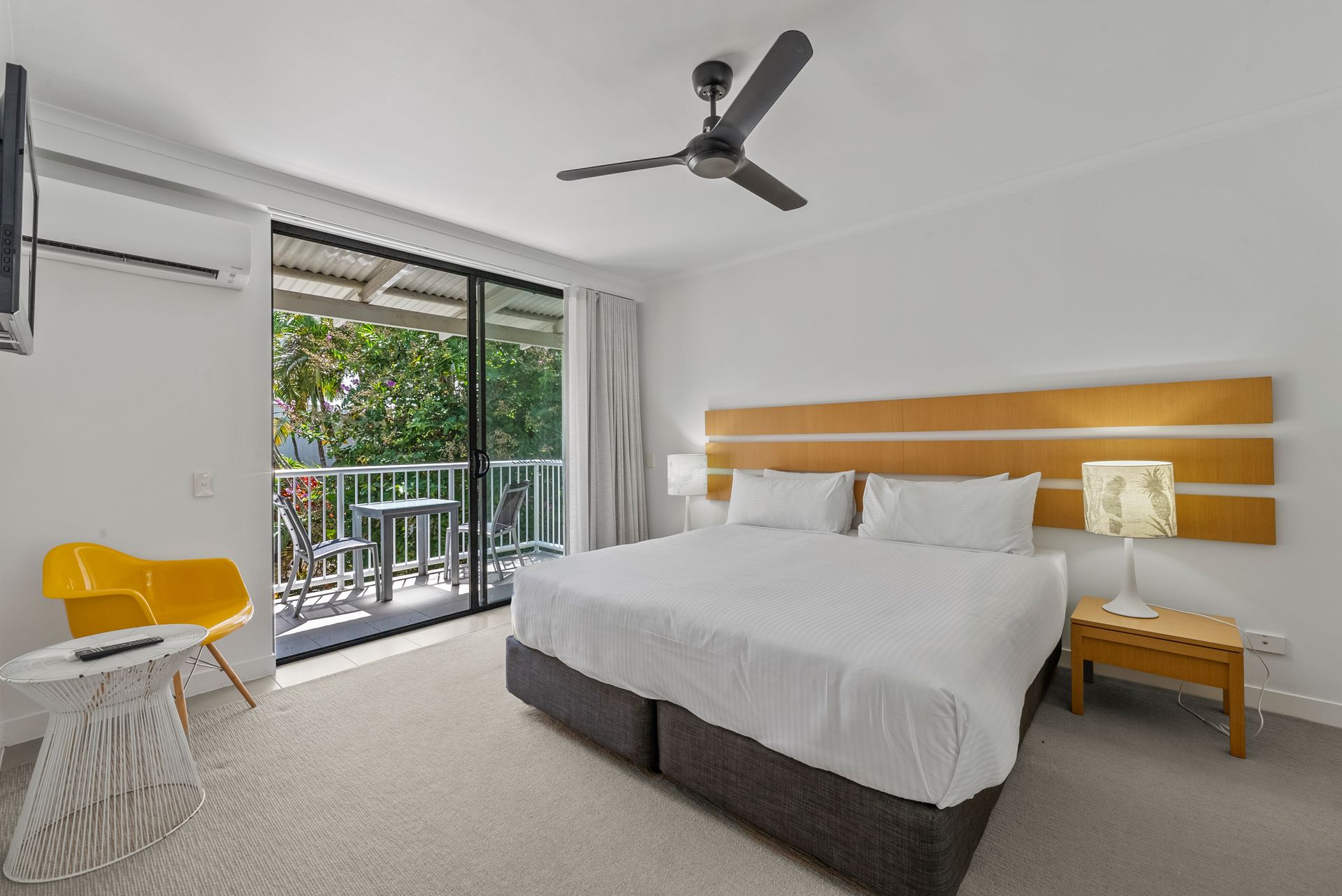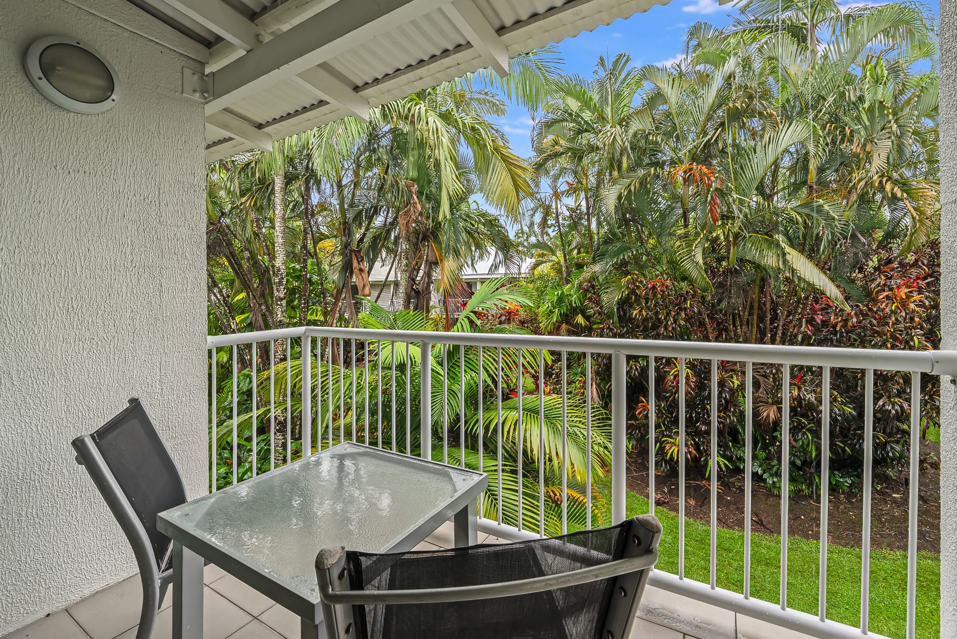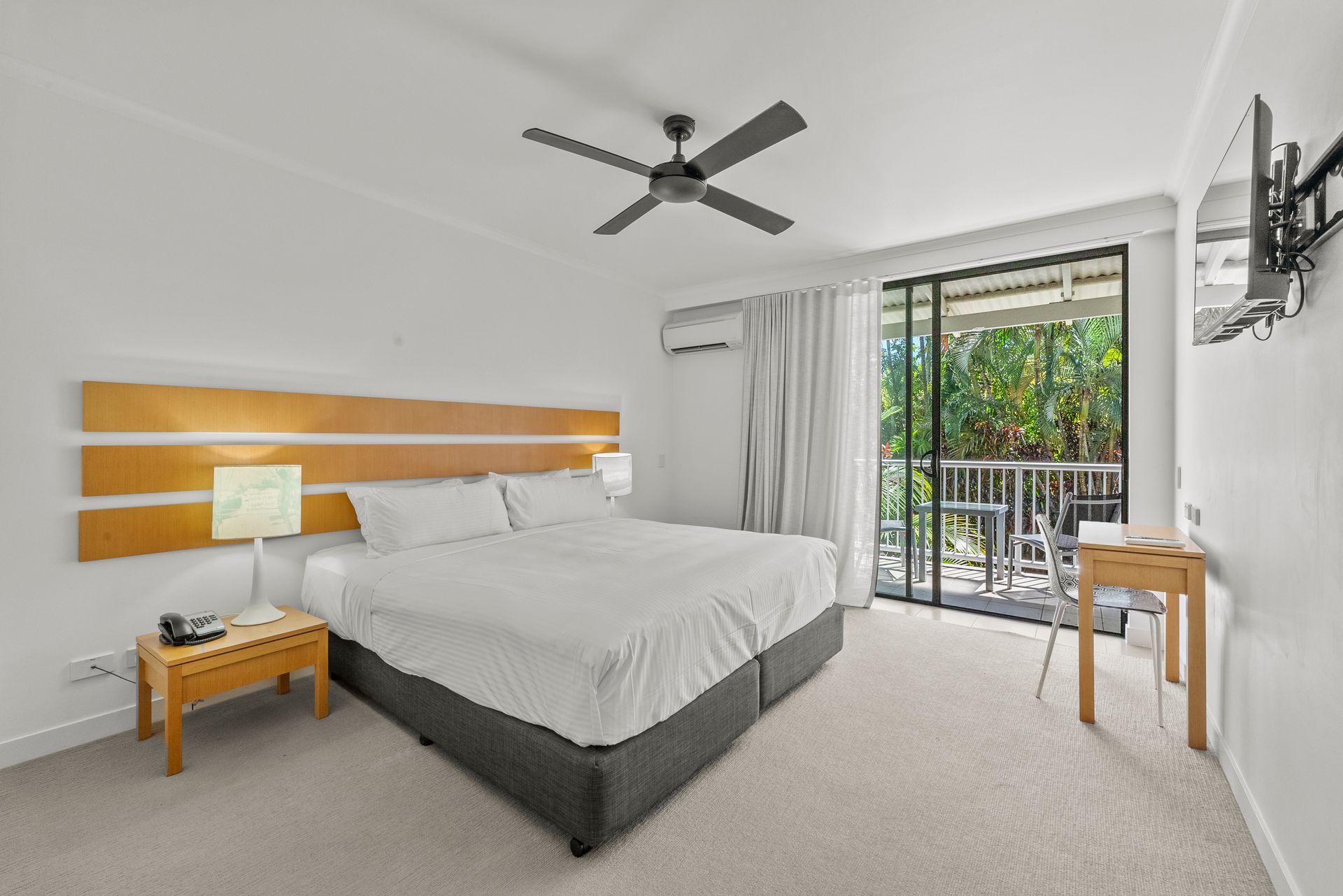 The generous studio apartment is furnished with a king-sized bed, large shower ensuite, air conditioning, ceiling fan, wardrobe, small fridge, desk and private palm-fringed balcony.