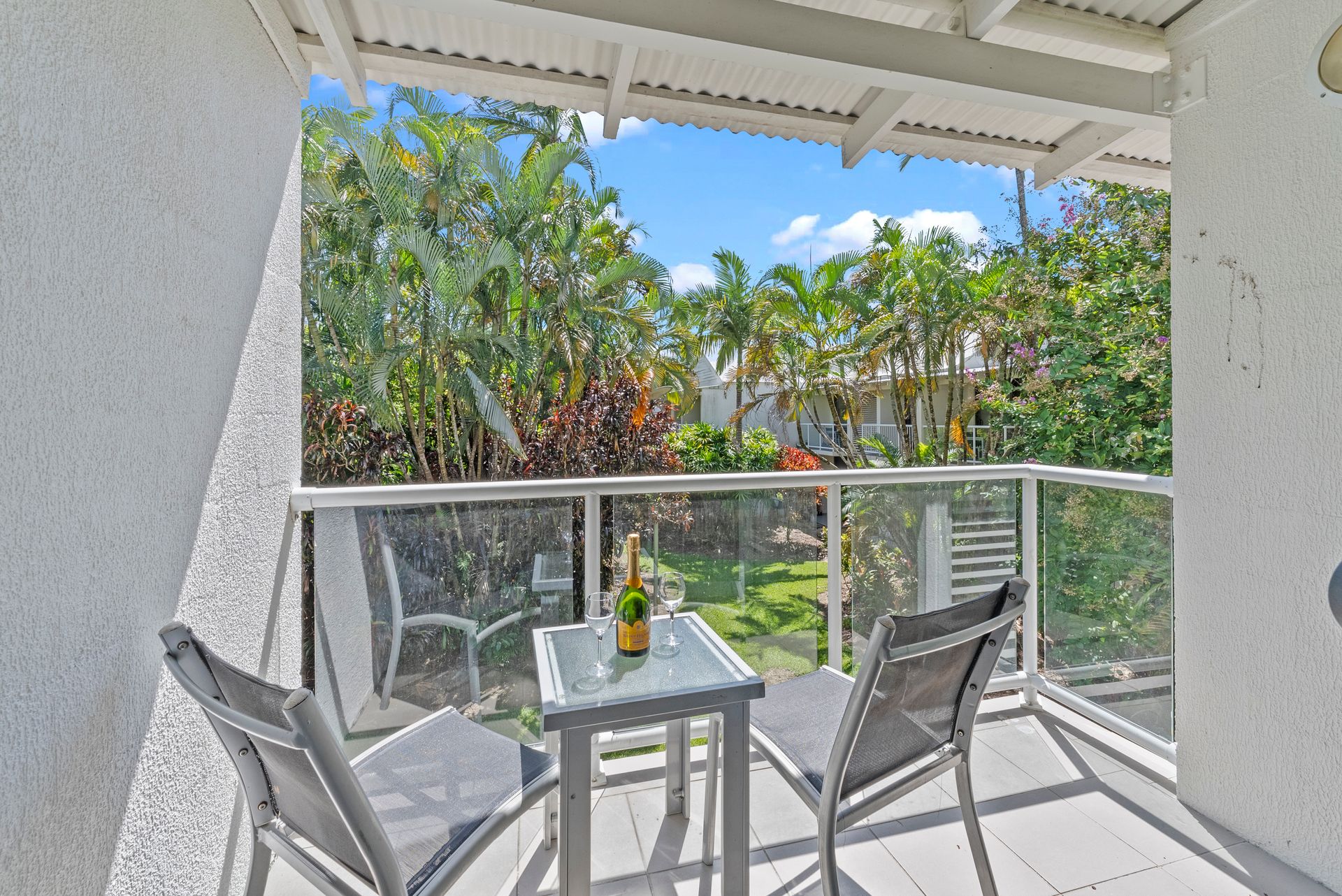 With its tranquil view over vibrant tropical gardens, the apartment features a king-sized bed, air conditioning, ceiling fan, wall mounted TV, desk, neutral carpeting, crisp white decor and a shady, covered, private balcony – the perfect spot for a morning coffee or afternoon refreshment.