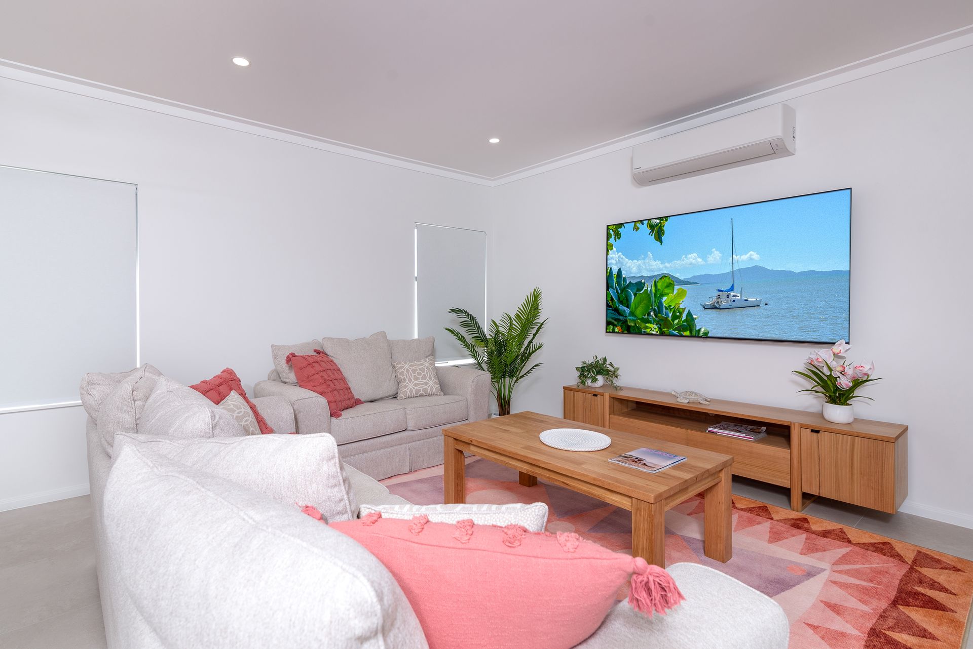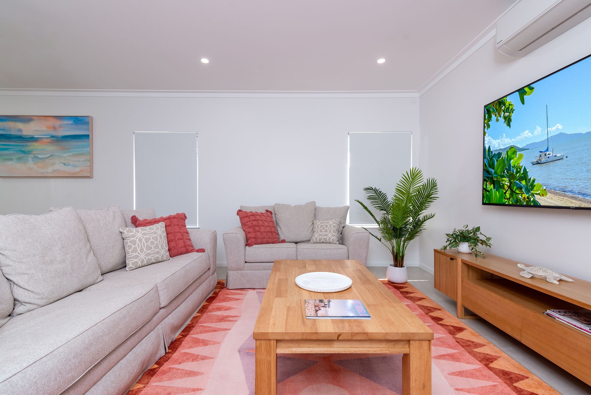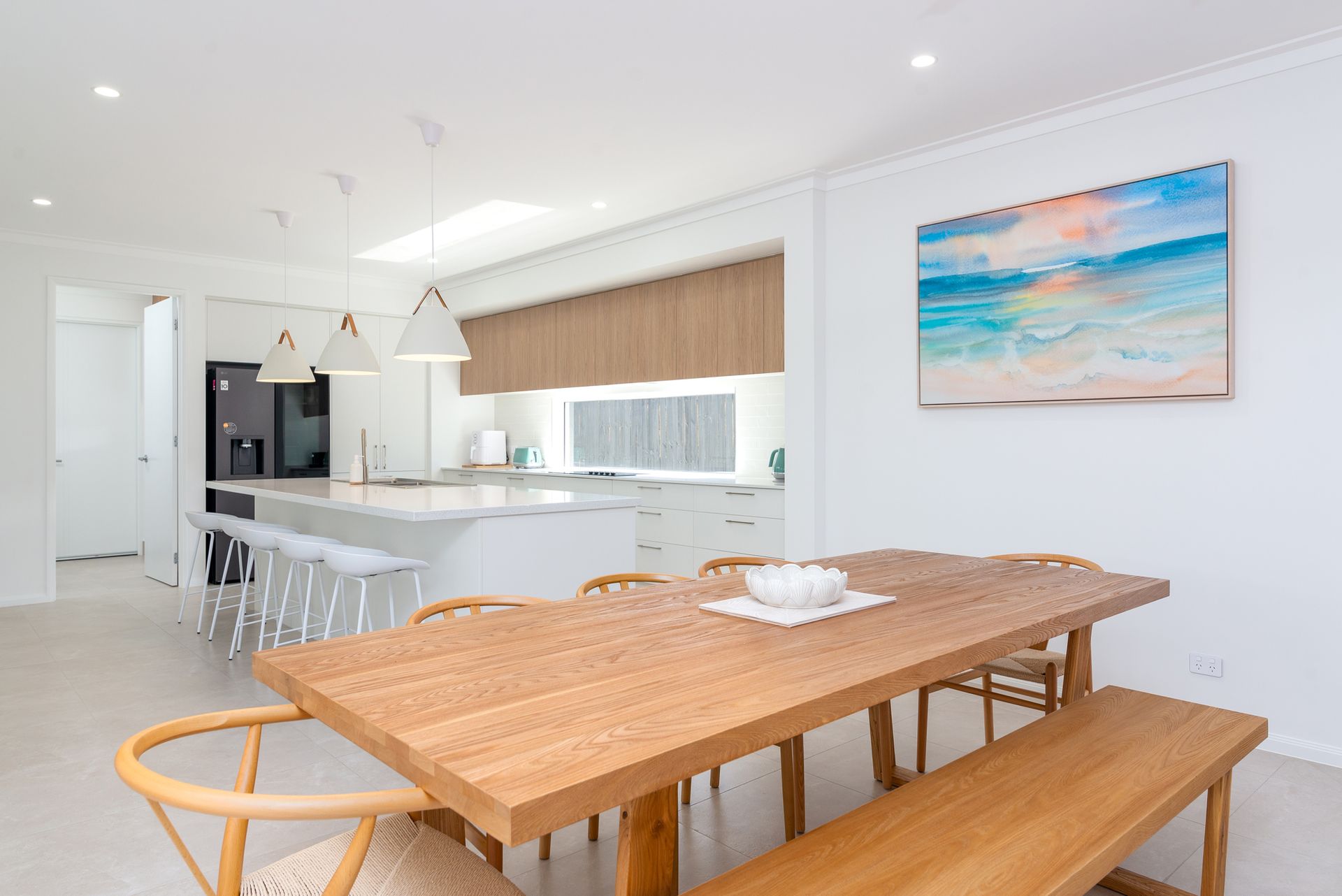 Perfect for families or friend groups, this modern home combines air conditioning, ceiling fans, cool contemporary tiling, crisp white decor and a flowing open plan living, dining and entertaining space for maximum comfort and convenience.