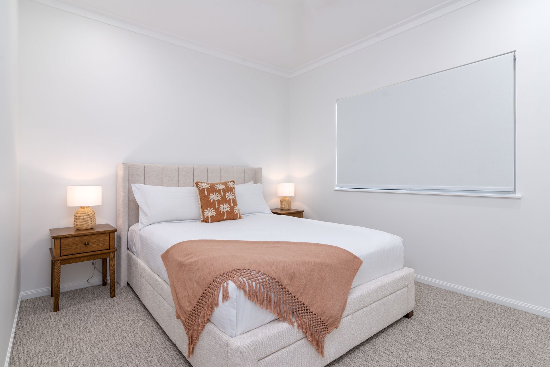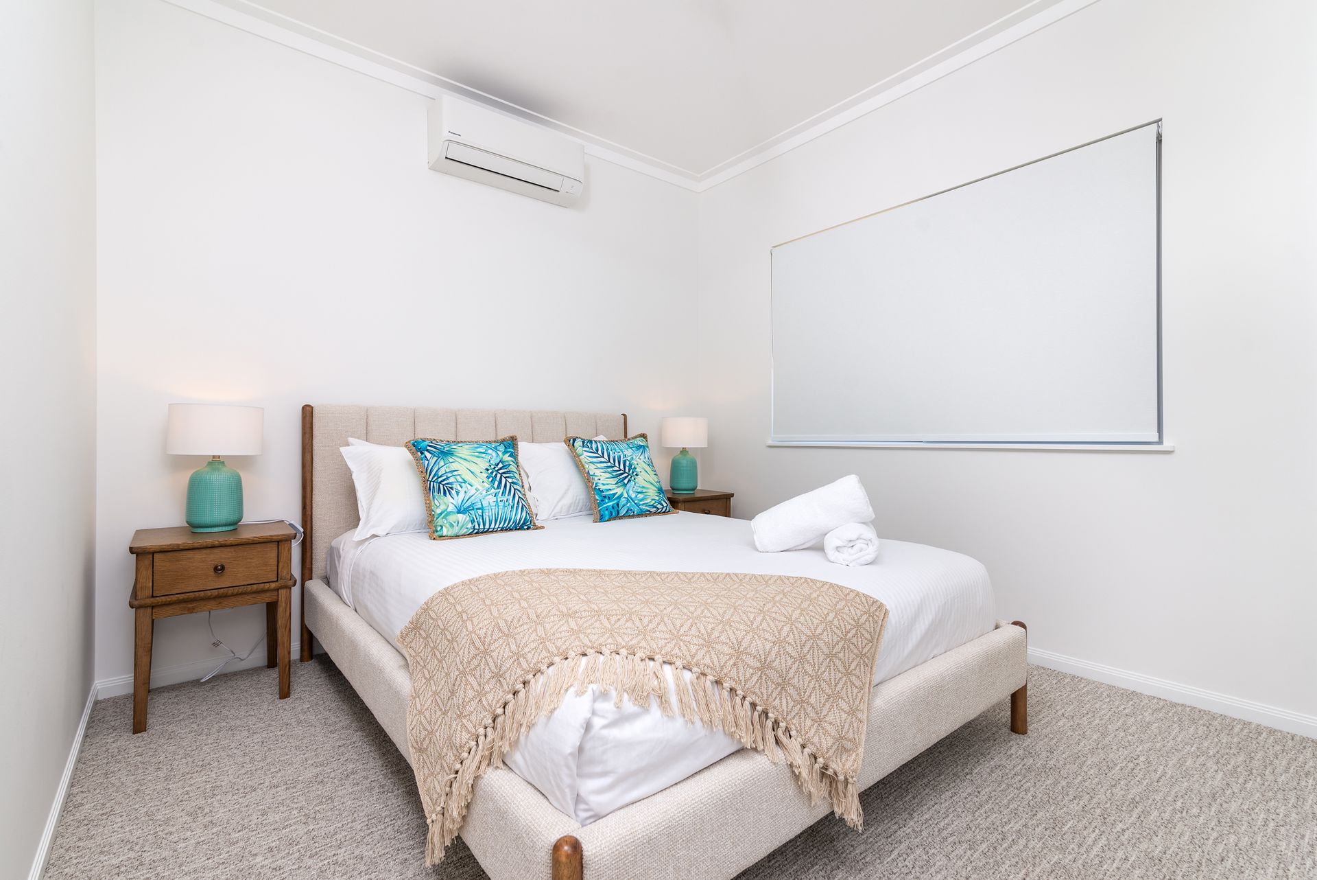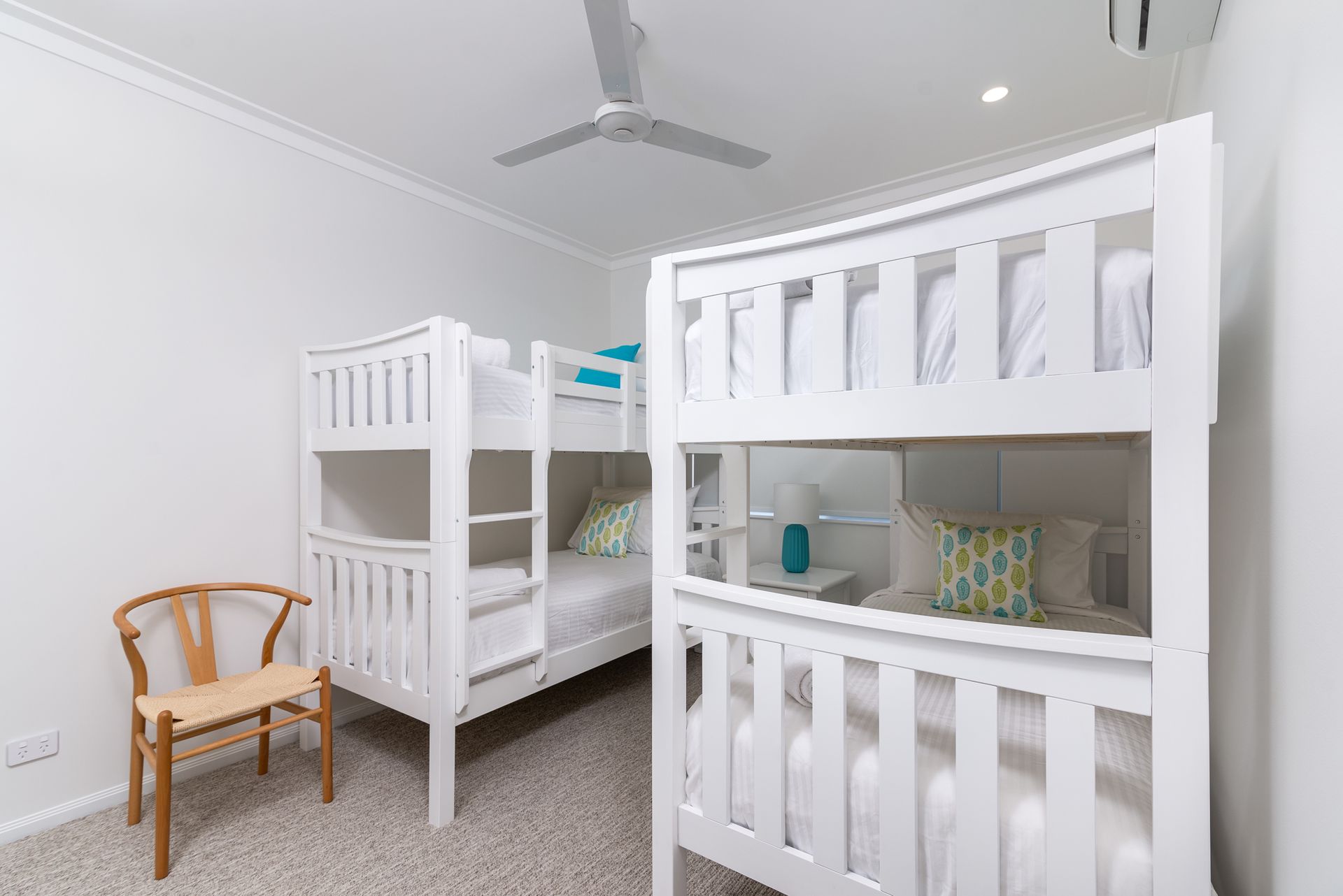 All four bedrooms feature air conditioning, ceiling fans, built in storage and carpeting. The Master suite features a king bed while 2 bedrooms offer upholstered queen beds. The fourth comprises a pair of double bunks (4 single beds).