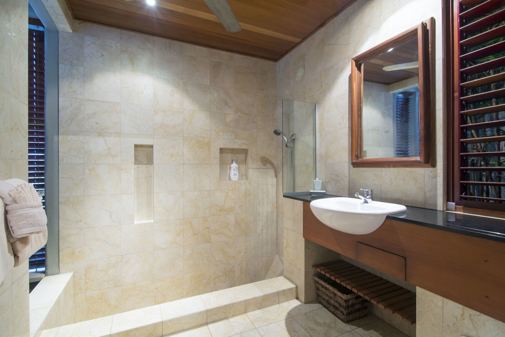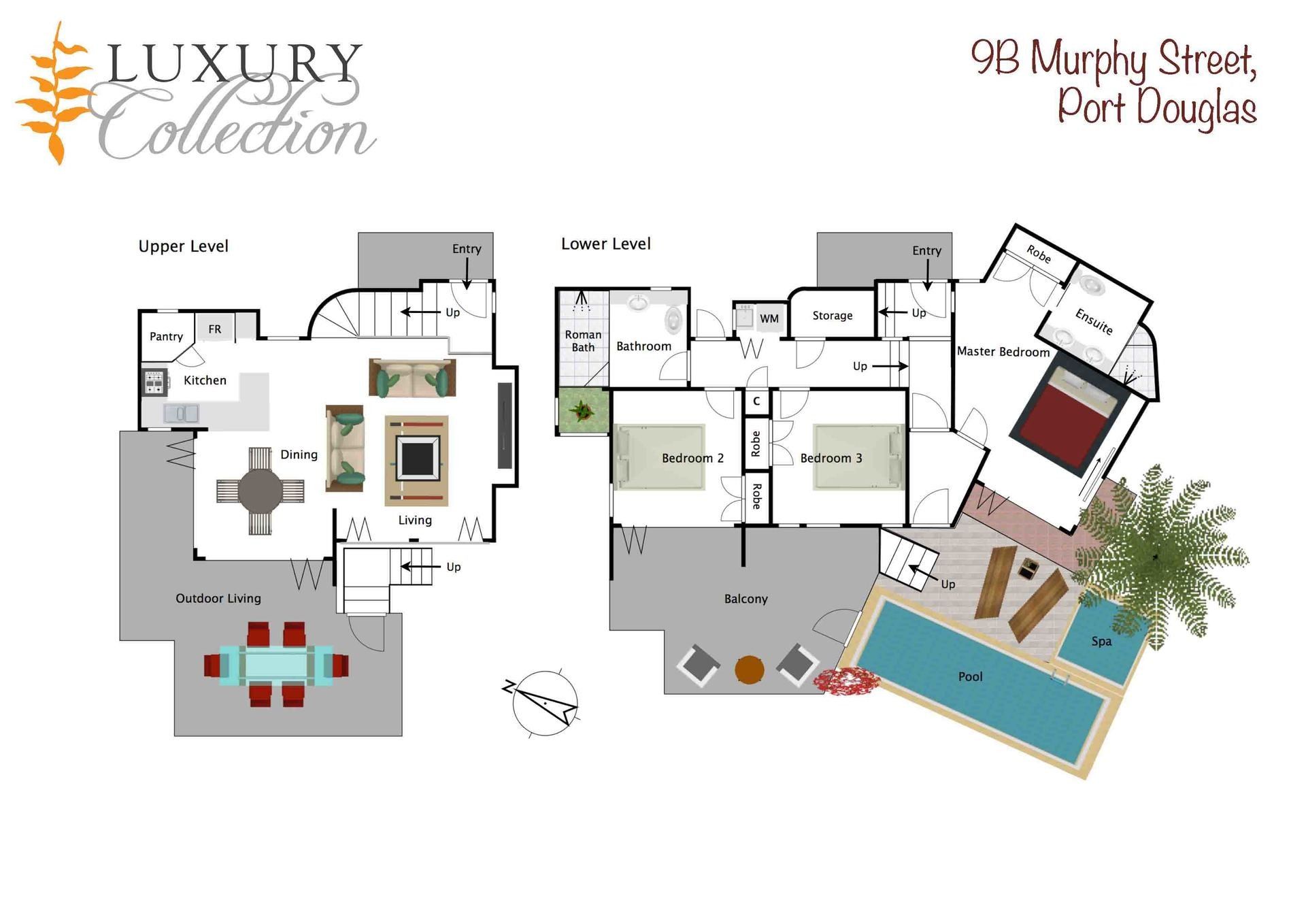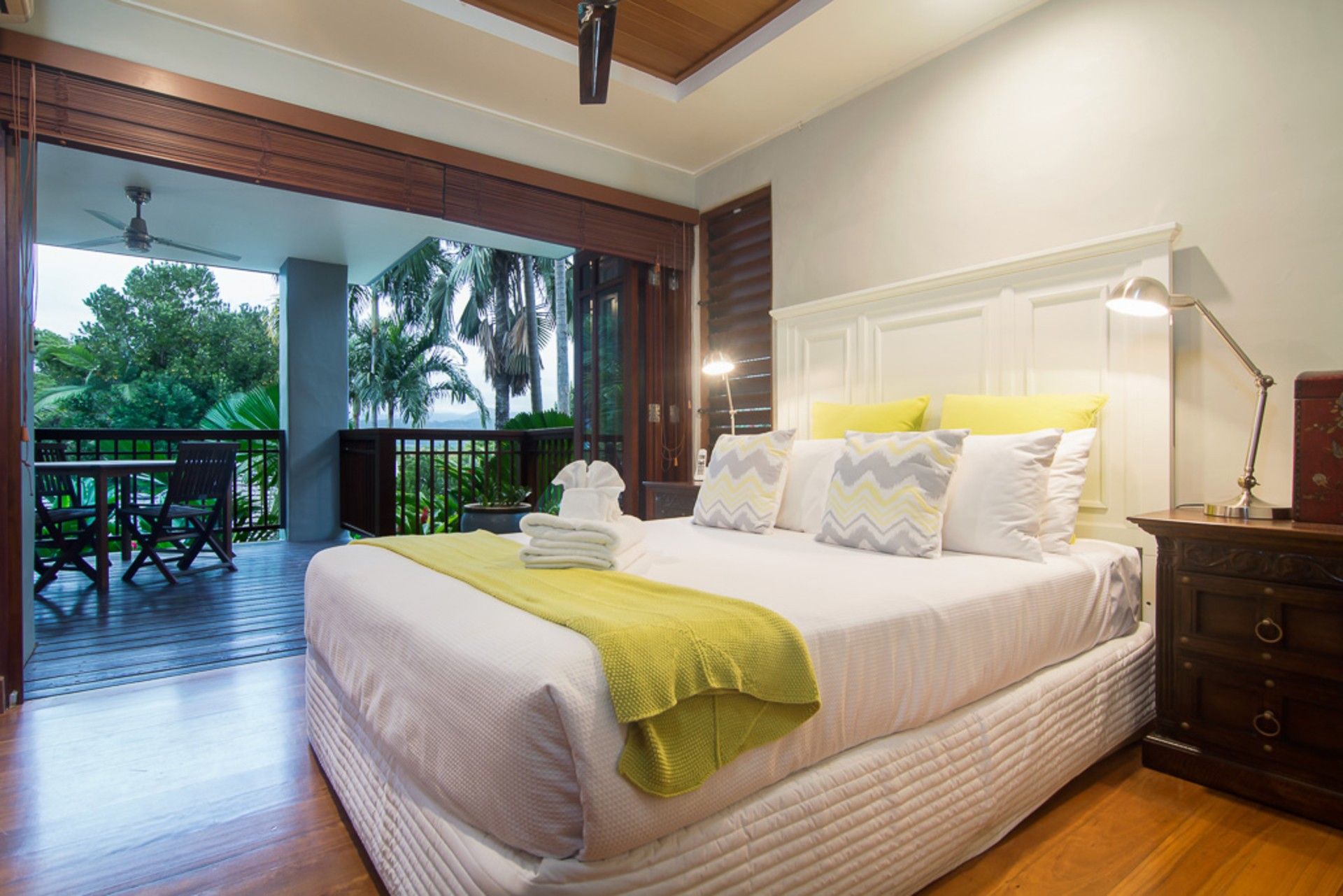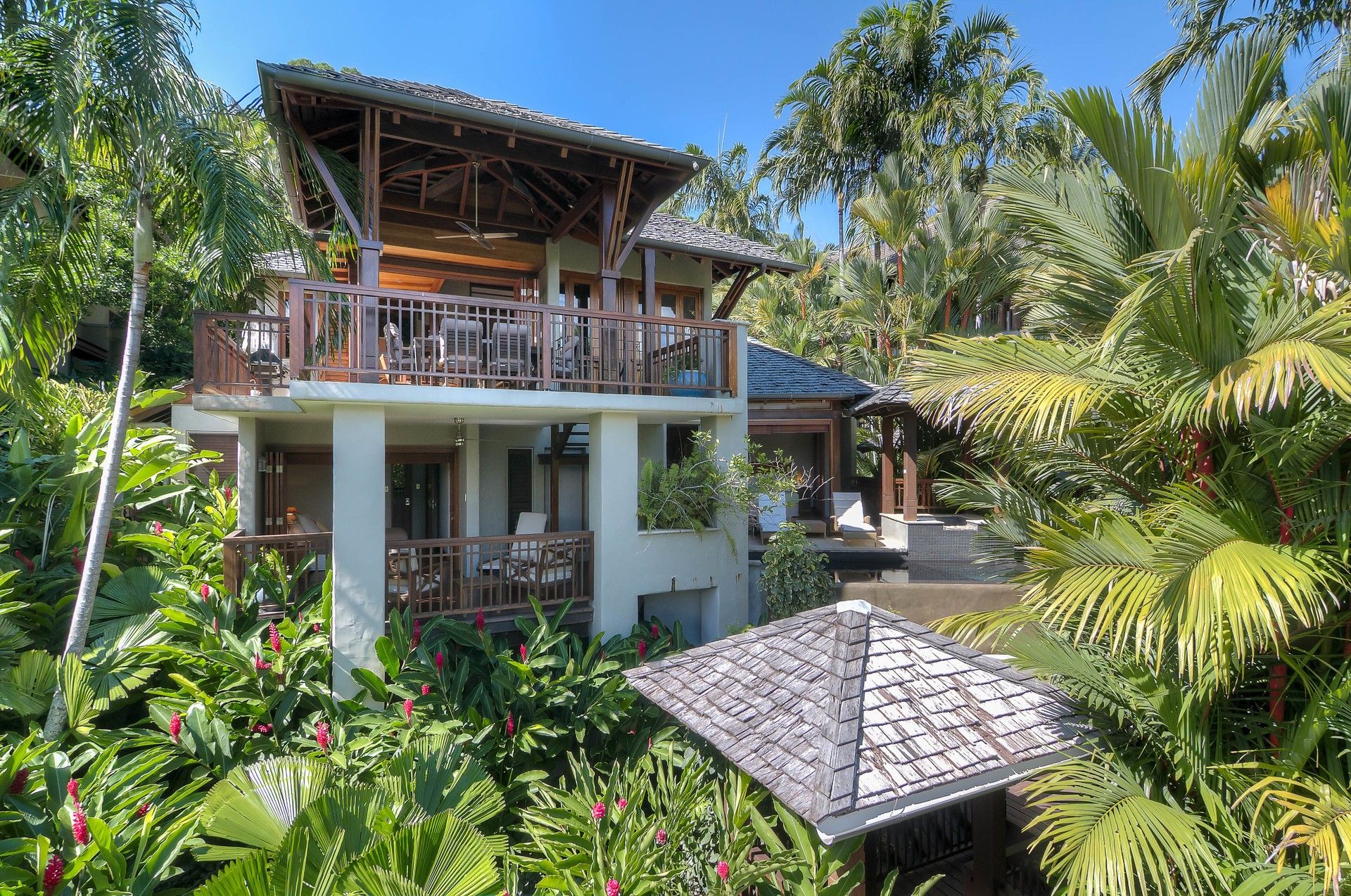 The lower level hosts the master retreat, with walk-in dressing room, en-suite, and private balcony opening out to the tropical private heated pool and views toward the mountain ranges.