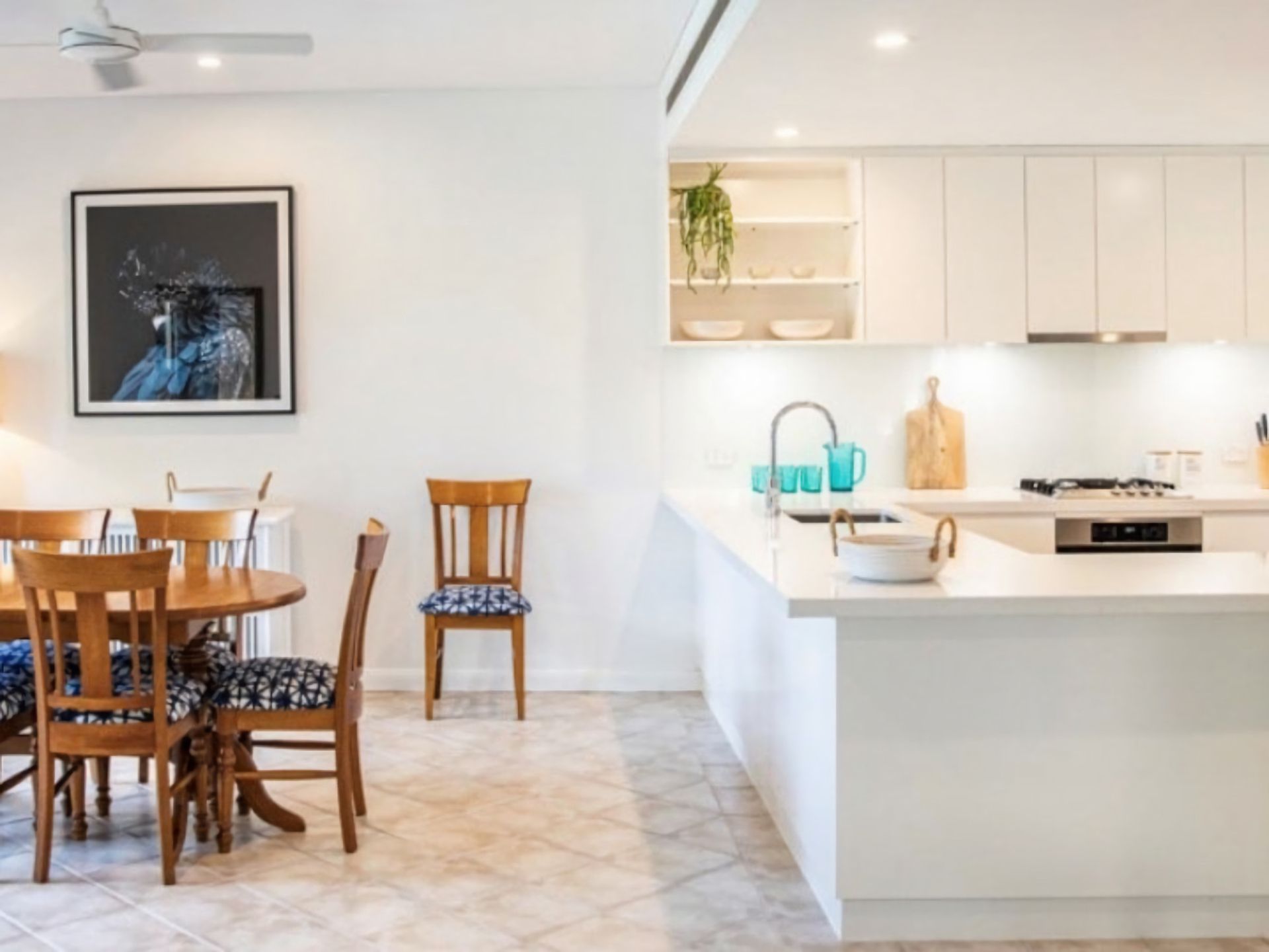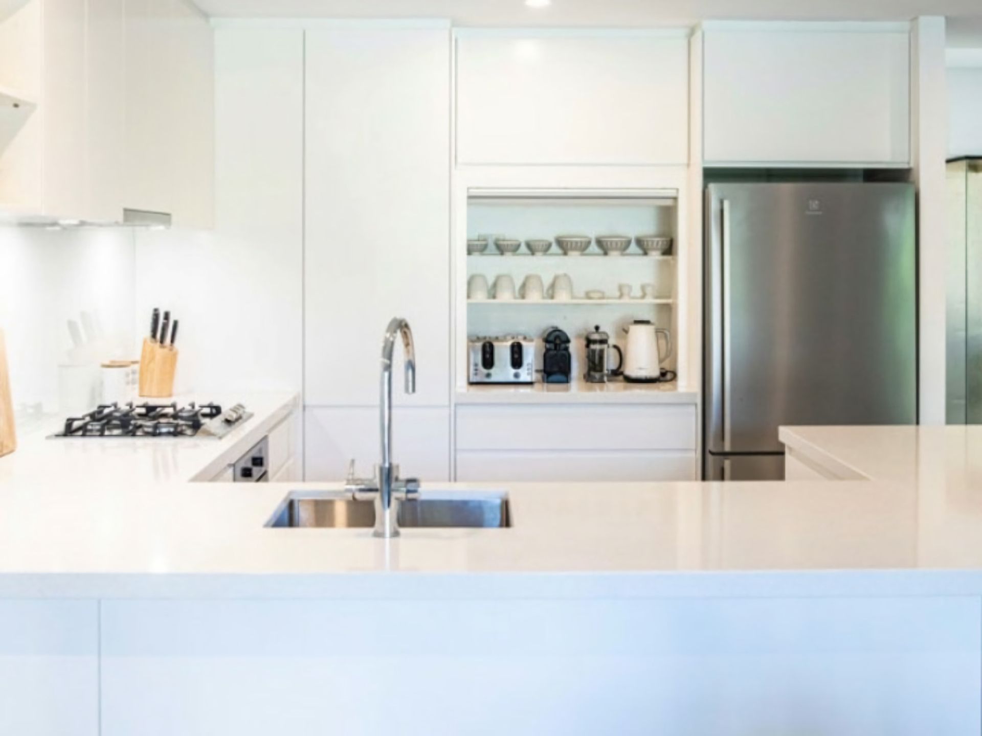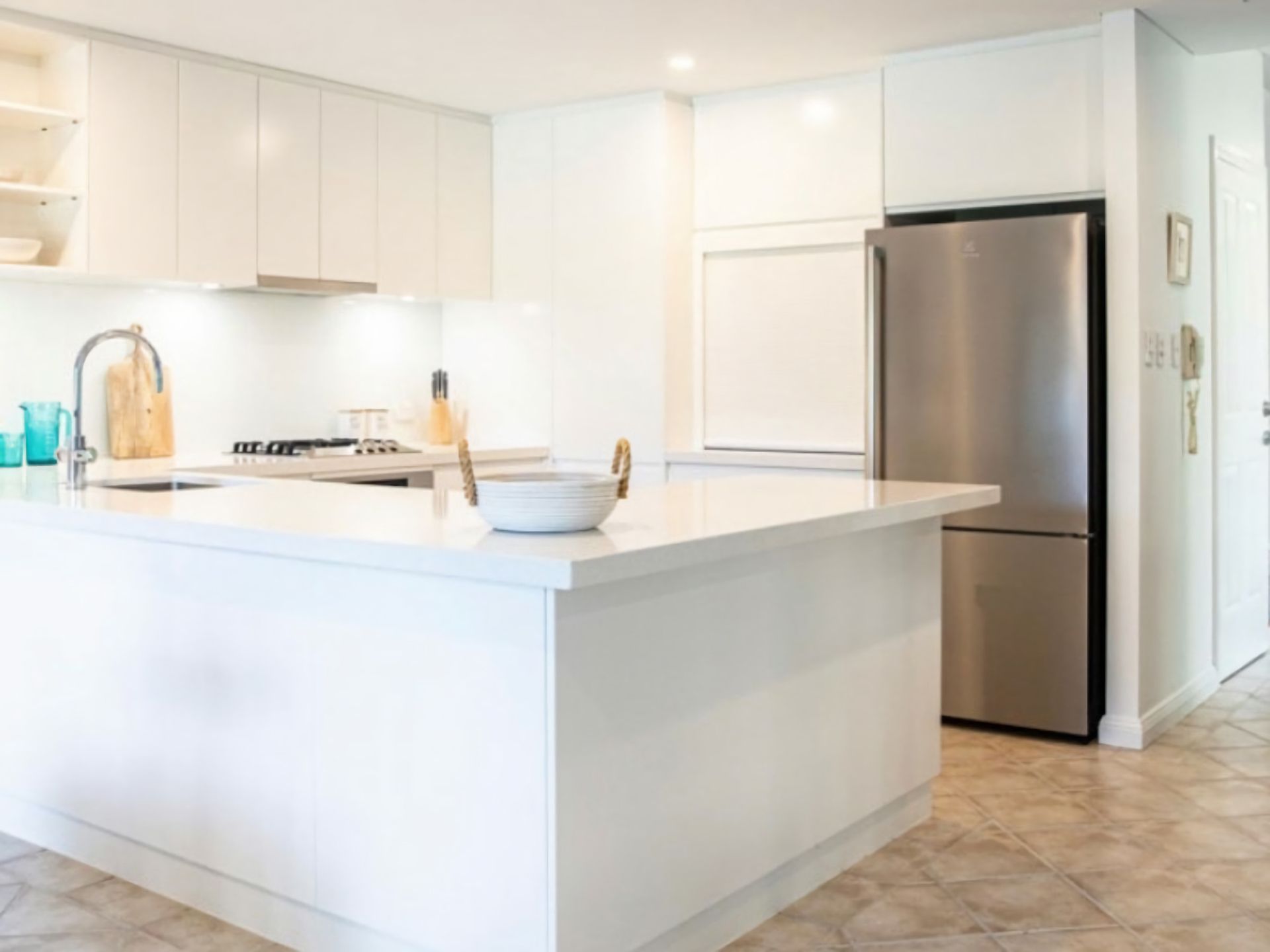 The focal point of this space is the large, fully optioned kitchen that provides all the creature comforts including stone benchtops, gas cooktop, full sized oven, dishwasher, large stainless steel fridge/freezer and excellent storage.