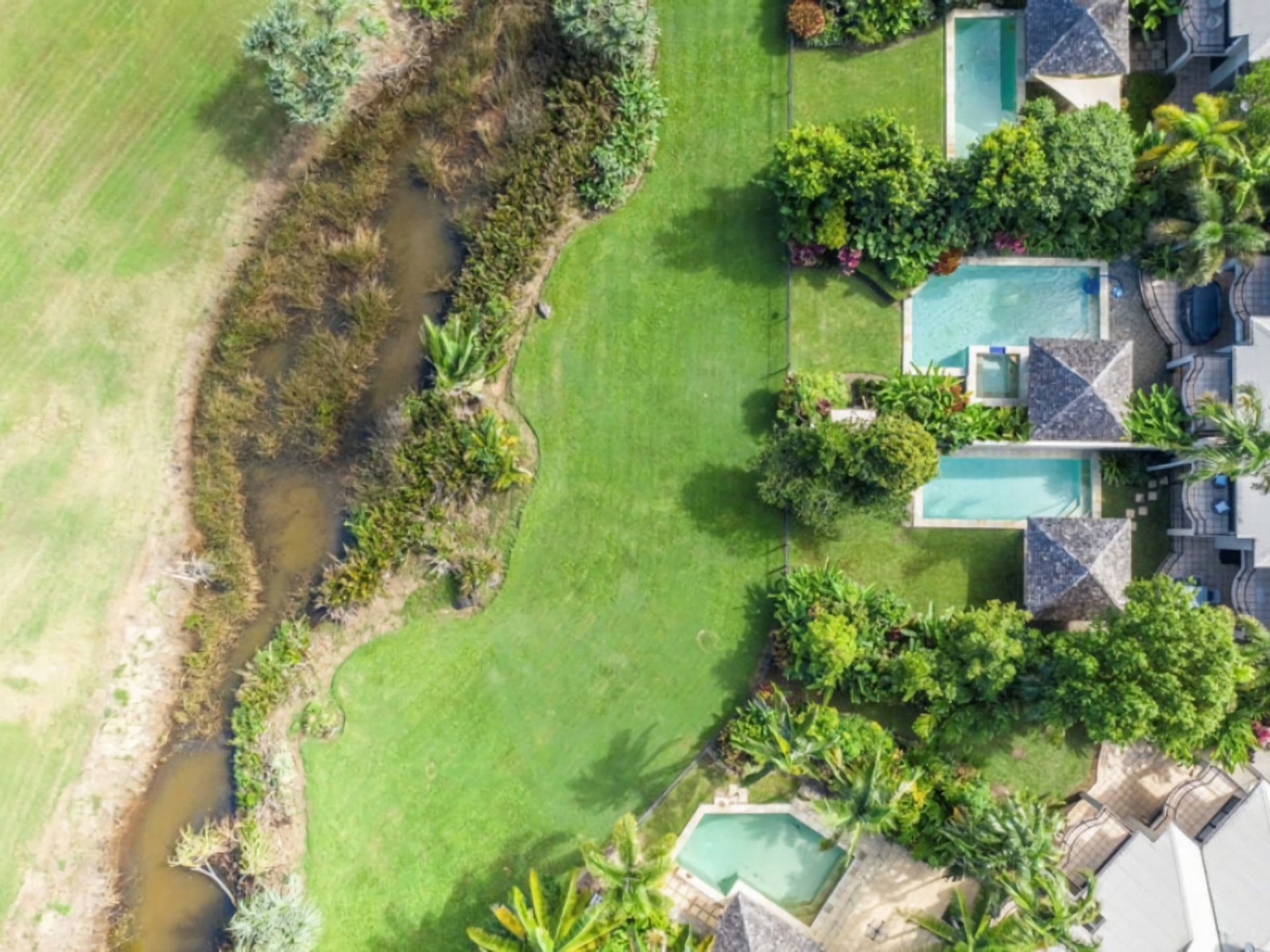 The villa’s private, good sized yard offers excellent space for a refreshing swim, relaxing poolside under the cabana, or walking barefoot across the lawn.
