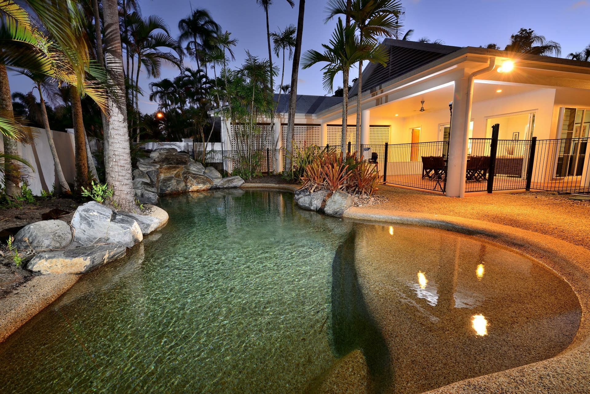 Comprising four generous bedrooms, two contemporary bathrooms (bath and shower options) an open plan living and dining space, second lounge, large kitchen, laundry, tiled alfresco patio, freeform lagoon-style pool and grassed-lawn-garden area, your comfort and privacy is assured – all within 500 metres of famous Four Mile Beach.