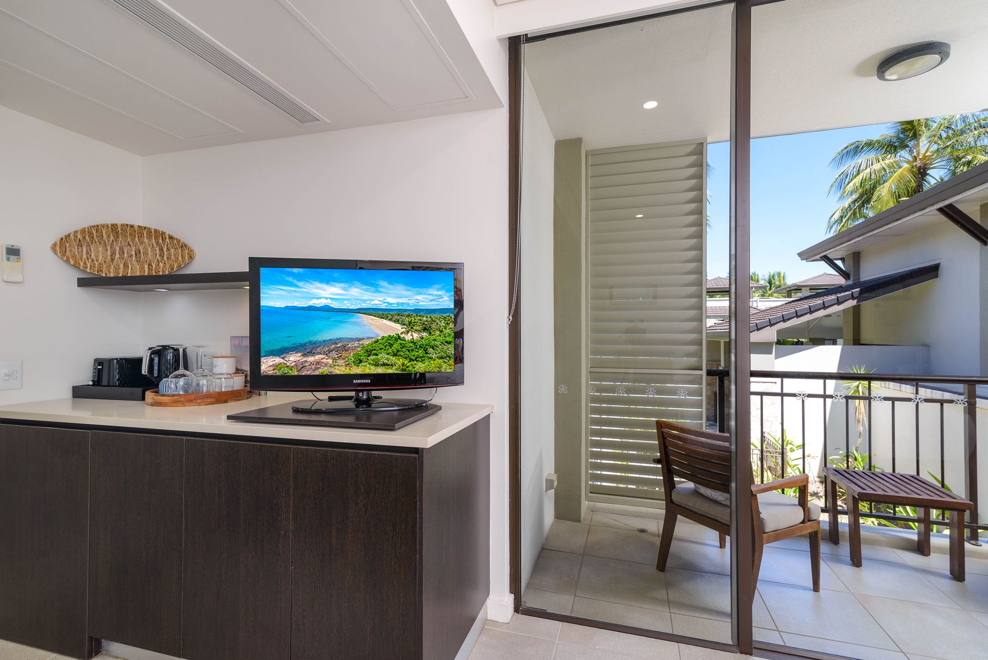 The apartment’s three bedrooms can easily sleep up to six guests, with children more than welcome at the family resort. The bedrooms are comfortable and cool. The master bedroom features Ensuite bathroom and doors that open to the patio, whilst the studio bedroom boasts a jetted spa bath and views over the pool.