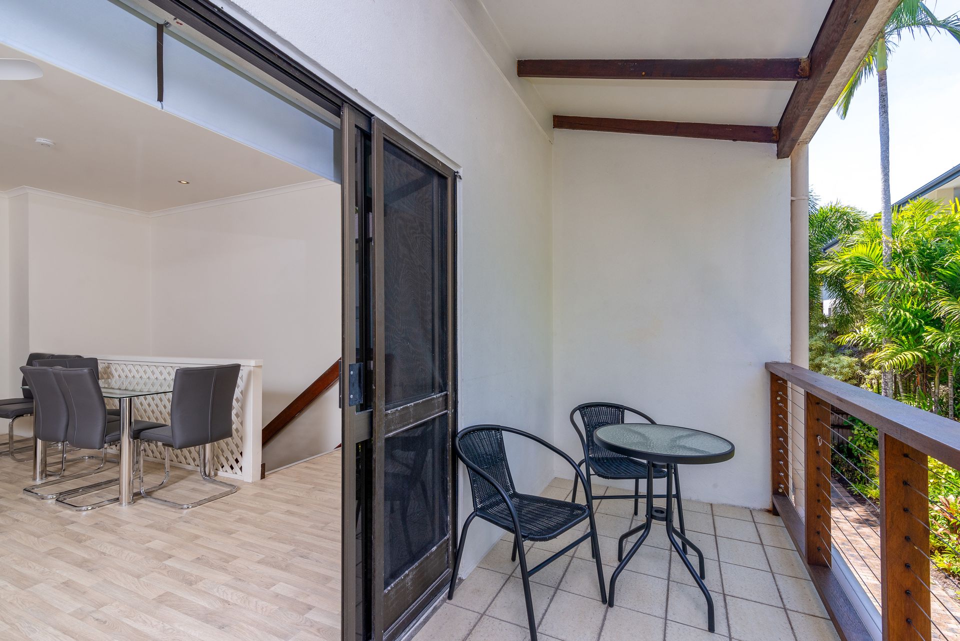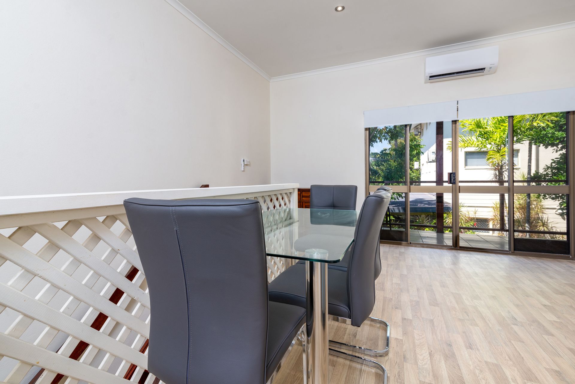Timber-look hybrid flooring adorns the air conditioned lounge and dining space that opens onto a breezy balcony with barbeque for an alfresco dining option.