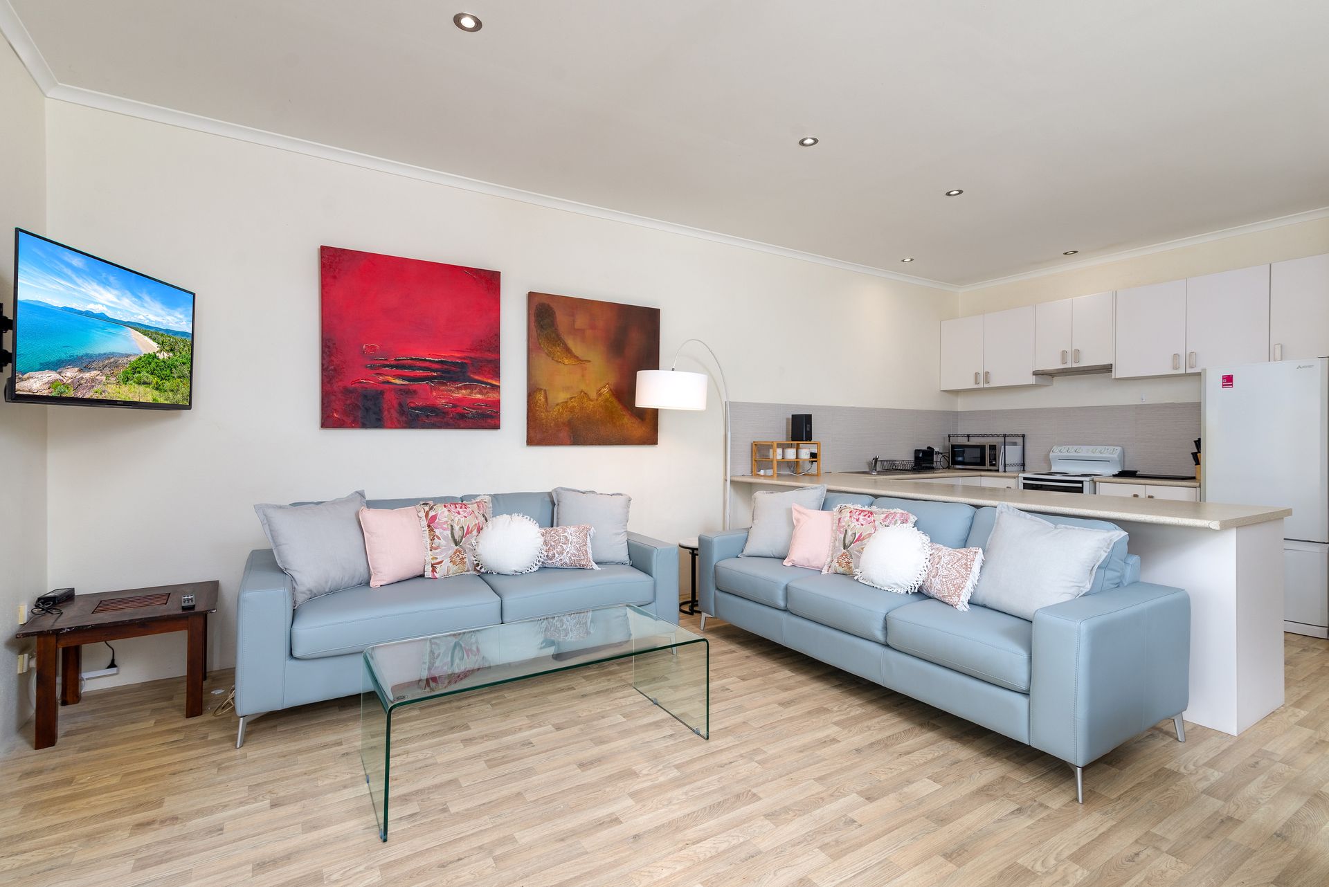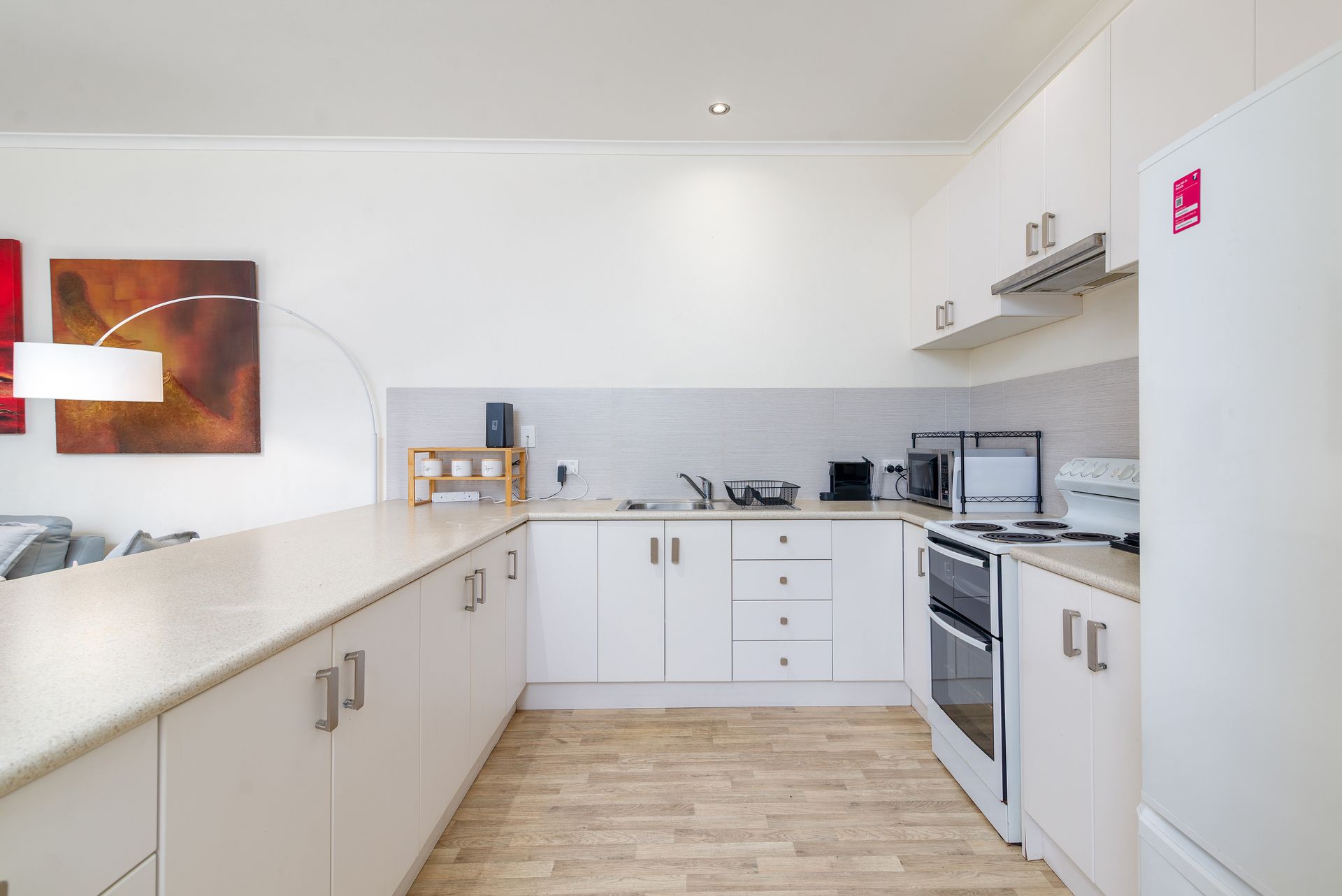 Fully optioned for a comfortable holiday stay, the kitchen is fitted with a freestanding oven/cooktop, microwave, fridge, excellent storage and bench space and all your small appliances, crockery, cutlery and glassware.